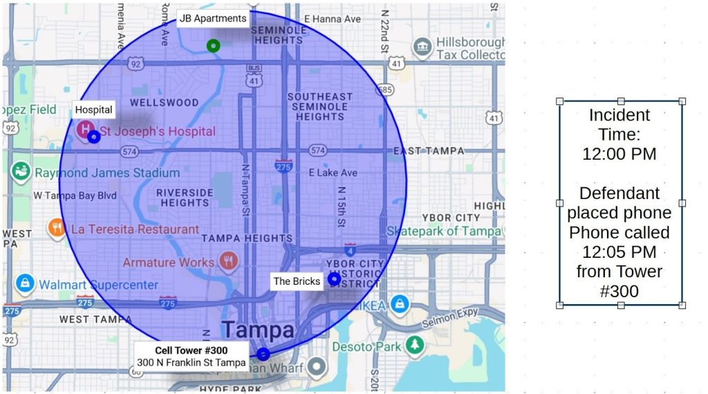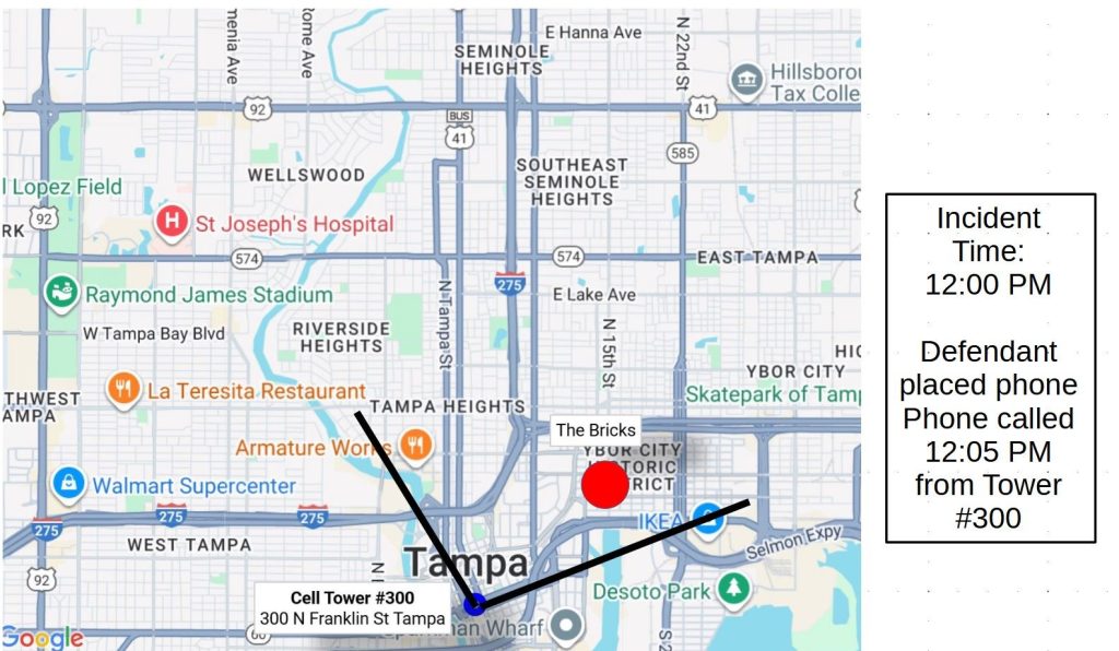 A cell phone record for the defendant’s phone shows that at 12:05 PM he placed a called to his girlfriend. The record also shows that at the time he placed this call his phone was connected to the cell tower located at 300 N. Franklin Street in Tampa. That cell tower is the tower your phone would connected to, if you were at the location of the incident. The cell phone records are highly reliable. As a juror, what would you conclude? It seems that the defendant was in the area of the incident.