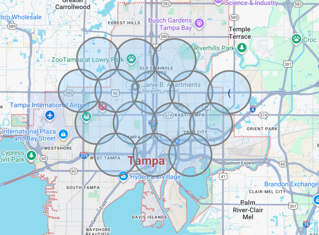 5. In this specific case, the Cell Phone Tower Defense Lawyer and defendant claimed he was at work at St. Joseph’s Hospital, (shown inside the coverage area to the upper left) and left work, called his girlfriend and told her he was headed home. Home was the JB Apartments, also within the coverage area of the Franklin Street tower as well, and is shown inside the top of the coverage area. His alibi is consistent with the facts presented by the cell phone evidence.