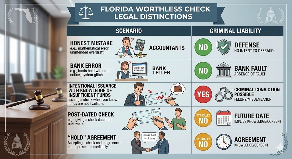 An honest mistake—such as relying on a pending deposit, a bookkeeping error, or even confusion about account balances—can defeat the State’s case entirely. Criminal law does not punish negligence; it punishes intentional wrongdoing.